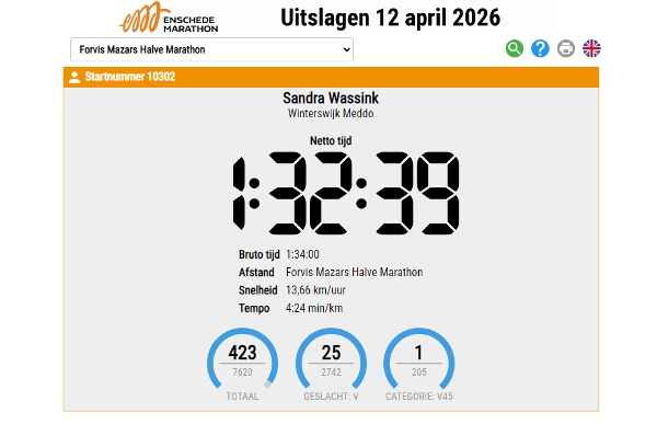 Sandra liep de halve marathon in Enschede. Ze werd 1e bij de vrouwen
