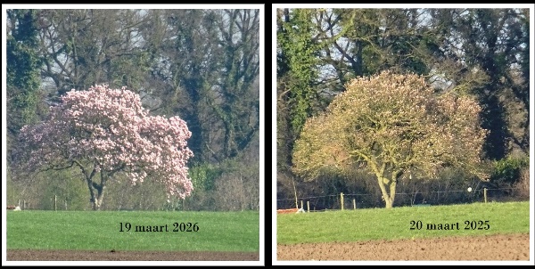 7 maart. In Meddo een min. temp. van 3,4 gr. De zon was er wel